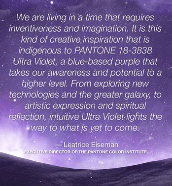Laurie Pressman, vice-president of the Pantone Colour Institute, said: “The Pantone colour of the year has come to mean so much more than ‘what’s trending’ in the world of design; it’s truly a reflection of what’s needed in our world today. The perfect colour for a Summer wedding? Ultra Violet is a deep, blue-based purple—darker than lavender, cooler than plum, but brighter than eggplant—with cosmic undertones to evoke “originality, ingenuity and visionary thinking that points us toward the future.