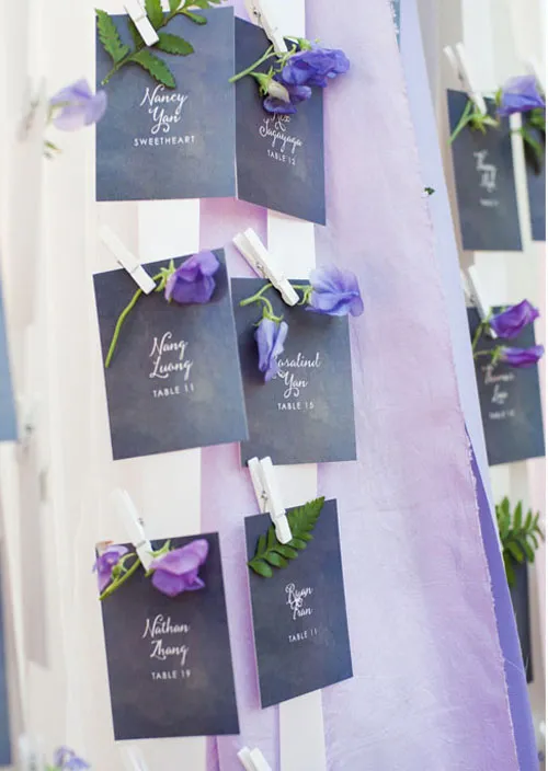 novel idea for an alternative to place cards is to write the guests' names in white or metallic marker pen on an individual flower such as a purple anemone and place it on the table, plate or napkin OR why not add a sprig of lavender to the napkin to enhance the place setting.